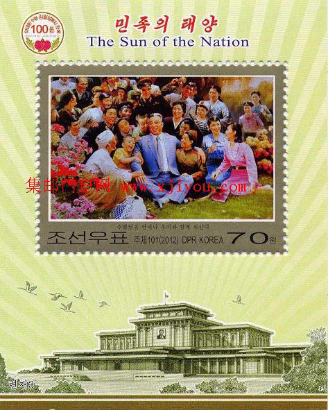 据报道,纪念邮票包括一种套装邮票,一种小型整张邮票及一种个别邮票。套装邮票主要取材于金日成肖像和描绘陪伴夫人金正淑的情景的美术作品,小型整张则印有在万景台老家里金日成夫妻的形象。个别邮票采用以万景台老家、金日成花、木兰为背景,突出“100周年”字样的图案。集邮门户网转载另外,朝鲜为宣传金日成革命伟业还发行了第三种连载邮票:套装三种、小型整张一种、个别邮票七种。