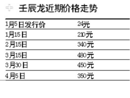 作为龙的传人,国人对龙的感情尤其特殊,也许正是如此,才造就了壬辰龙邮票的涨价神话,自1月上市后,价格为24元的壬辰龙大版票价格半个月内直接暴涨至200元左右,进入三月又涨至340元,到3月中旬一路飙升到480元的高位。正当投资者沾沾自喜自认捡了一只朝阳股的时候,壬辰龙价格却急转直下,跌至350元左右,跌幅20%有余。邮票收藏家吴先生介绍说,佛山有一些藏友在420元左右的高位接盘,目前已经损失近万元。而他自己因为接手较早,目前还略有盈余,但对于壬辰龙的后市则持保留态度。