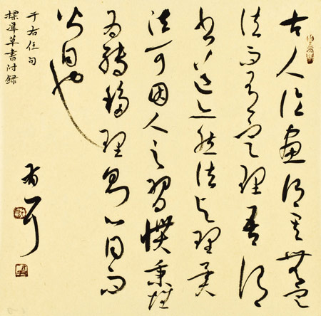 民华多次入选国展和中国书协举办的单项展,并在一些赛事中获奖,是近年来书坛展露头脚、比较有影响的一位中青年书家。而我更多关注民华的不是他入了多少展,获了多少奖,而是他作品本身,是他作品中所流露出的信息。因为我们已经走过了对入选各种展览、获奖,加入中国书协有着强烈愿望的年龄。追求书法艺术的过程到最后会发现,书法艺术到最后不是为了入展,不是为了获奖,不是为了所谓的名和利,而是内心的一种需要,而是写给自己。写字能安抚我们的灵魂,是内心情感的需要,是一种生活状态,也是我们生命的一部分。有了这样的体会和认识,我们在面对书法艺术,在进行创作(此时创作已是一种自然书写,没有更多的刻意和设计在里面)时,就会从容很多。正如很多人写了一辈子字都不知道书法艺术究竟要表现什么一样,不是每一个人都能有这样的体会和认识,这需要天赋、悟性,更需要后天的读书和阅历。我想,民华应该感谢他远离祖国在苏丹和乍得工作的那几年。民华多年以前的书法风格已模糊不清,对他的作品印象深刻,是从他到苏丹工作后通过他的博客开始的。一个人远离祖国和亲人,不能参加更多艺术交流活动,身边也没有更多的书家可以探讨。民华的内心无疑是孤独和孤单的。孤独,内心的孤独是艺术产生的源泉。只有能够面对孤独、享受孤独的人才称得上心智成熟的人,也才会对人生、对艺术有深入理解。那一时期,民华沉寂下来了,在二王一路的小字上下了很大功夫。但与很多人不一样的是,他的作品除了表现出精良的技法以外,还有很多情感的因素,或孤寂,或苦涩,或伤感,或离愁……我想这与他的内心世界有关,也与工作在那样一个特殊的环境有关。因为除了书写,他没有更好的方式去排解内心的孤独寂寞以及那淡淡的乡愁。长达几年下来,用书写这样的方式抒发情感、用笔触去对应内心世界的波澜已经成为一种习惯。有了这样的书写习惯后,表达情感、抒情达意就成为临帖和创作的一种自然状态,包括民华后来的一些隶书作品,一些大幅草书作品,也都浑溢着一种浓郁情感。作品中透过具体章法和字形跃动于纸上的那些真挚情感,才是作者与观者交流和共鸣的真正媒介,没有人类共有的情感,如何产生共鸣?这是民华作品的可取之处,也是我看重他的原因。