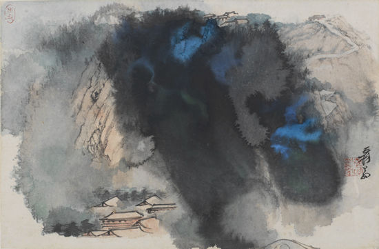 张大千的画作《云山古刹》布局有序,主次分明,中间采取泼墨泼彩之法,形成墨色酣重的主体山脉,营造出烟风云雾漂浮于山林上空的奇景,不但具有意象迷离的浪漫气氛,也有相当强之写实效果。周围以淡彩泼染,把如真似幻的抽象造型与大自然具体形象有机地、完美地结合在一起。远处则用笔勾勒群山屋舍,与泼墨泼彩形成的云雾虚幻相映衬,更显苍茫,瑰丽绚烂。画幅采取了鸟瞰构图之视点,气势庞大,造境雄奇,运笔舒缓迅疾,墨韵浓淡虚实,淋漓尽致地展示了大自然的万千气象。艺术源于自然而又回归自然,这种中西结合的全新画风,使山水作品之画面更加浪漫自由、灵巧新颖。