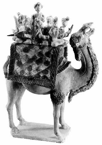 唐代三彩载乐驼,驼背上坐着一支小乐队,中间站一女伎,正在歌舞。乐队奏出的美妙音乐,让那高昂头颅的骆驼也听得陶醉。从陕西历史博物馆珍藏的这件稀世之宝中,人们仿佛听到从丝路传来的盛唐之音,感受到唐代艺术家的激情。