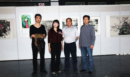 梁彩媚(左二)和导师陈再乾教授(左3)在画展上