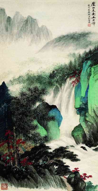 吴湖帆的绘画由古法入手,先“四王”而后融合南北宗法,造型工谨,笔墨精妙,色彩奇巧,自成一格。创作上于山水、花鸟、人物均有所涉猎,并精于书法、词章。其山水主要是改造古法为己所用,亦深得清新俊雅之意境。《庐山东南五老峰》为水墨青绿结合的山水画,为理想与现实结合之佳作。