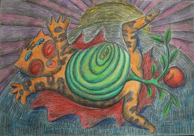 每个人都有一个度过恐惧的未成熟期。王芳芳的视角便停留在了这一时期,作为女性,她无疑更倾向于女性的母性和细腻。在她的另一幅《快乐与痛苦并存》彩色铅笔里,她画了地球、初升的太阳、乖乖虎内心里成长着的绿树和果实。试图告诉大家,“快乐其实是一件自然而然的事情,痛苦也一样。记得自己生孩子的时候,明明知道将要面临这一切,心里的不安,兴奋,害怕一直在脑海里打转。当自己真正面临这一切迎接新生命到来的时候,快乐掩饰了所有的痛苦!”