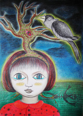 在一幅名为《胆怯》的铅笔画里,王芳芳更像是一个精神分析师,心理学家。她试采用解构、隐喻、抽象变形等现代艺术手法,精心地用线条为我们涂鸦出了阴霾的天空、头上生着秃枝的小女孩还有在枝上面闭目栖息的大鸟、草坪上的阴影等几个意象体。