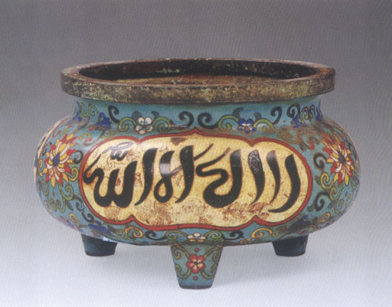 景泰蓝工艺在元代从中亚传入内地,明代逐渐风行,尤以景泰年间出现了较多的以阿拉伯蓝釉作底的铜胎金属器,故名。景泰蓝装饰艺术主要是植根于中国回族的伊斯兰抽象花卉图案,特征鲜明。清代景泰蓝工艺得到了进一步发展,并促进了回族伊斯兰风格金属器生产。清代回族景泰蓝器物多样,有瓶、炉、盒等。一般都有阿拉伯文开光,装饰图案以植物纹为主,口沿和底座也有饰几何纹的。植物纹有团花、莲花、牡丹、梅花等,花形具有中国传统花卉图案特点,而不是阿拉伯、波斯的抽象花卉图案,体现了中国回族伊斯兰文化中、阿结合的审美意识。