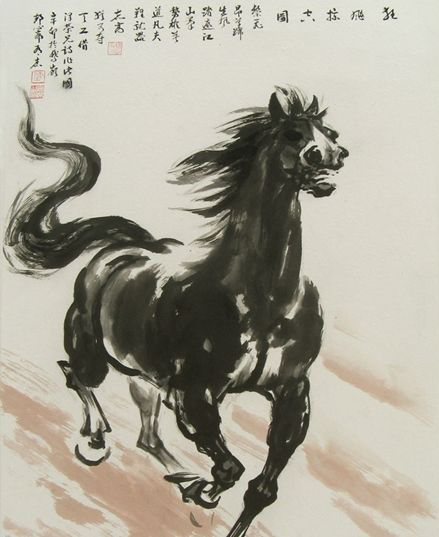 陈有杰深知,由山水而转至骏马,在艺术表现上自有一番苦衷。画界历来有“鬼魅易,犬马难”之说,马作为一种具体而规范的形象,对纵横天外的山水画家来说无疑是一种束缚。尽管如此,他还是执著地把笔墨献给了心中的骏马。因为在他看来,“龙马精神”作为中华民族的重要图腾,在今天更应当大力传承和发扬;而“兵强马壮”“马上英雄”这些雄浑昂扬的意象,更应当成为当代革命军人核心价值观的重要基因和人民军队勇往直前、自强不息的永恒力量。画家以收放自如的笔墨入乎规范,又以驰骋奔腾的艺术精神冲出樊篱,在造化与笔墨间勤钻苦研。终于,他深得动、静之大美,在山水画与骏马画之间达到了张弛有致的转换。画家以马喻人,悉心表现马的喜、怒、哀、乐,近90幅水墨、彩墨骏马各尽其态,注重精、气、神的呈示,而且诗书入画,韵味无穷,也体现了画家的艺术修养和文化内涵。