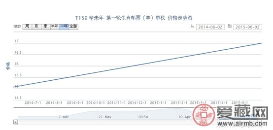 从价格走势图中,我们可以看到,此套邮票虽然发行之初为十五多,直到2015年5月份一直保持均匀直线上升趋势,说明他的市场价值逐渐上升,涨到了十七,涨到了值得大家收藏。