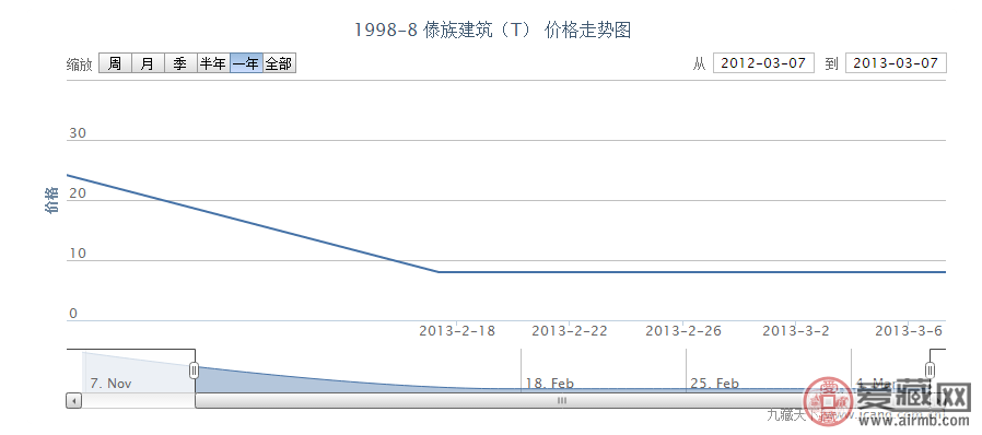 从价格走势上看,我们可以看到,此邮票自发行之初,就涨到了二十多的高价,由于市场需求,价格一直再调整,比之前的价格在匀速降低,到达2013年2月份的时候,市场相对稳定,价格保持在8元不变,该套邮票的美观足以征服你的眼球。