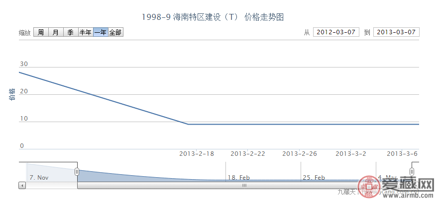 从价格走势上看,我们可以看到,此邮票自发行之初,就涨到了将近三十的高价,由于市场需求,价格一直再调整,比之前的价格在匀速降低,到达2013年2月份的时候,市场相对稳定,价格保持在9元不变,该套邮票的美观足以征服你的眼球。