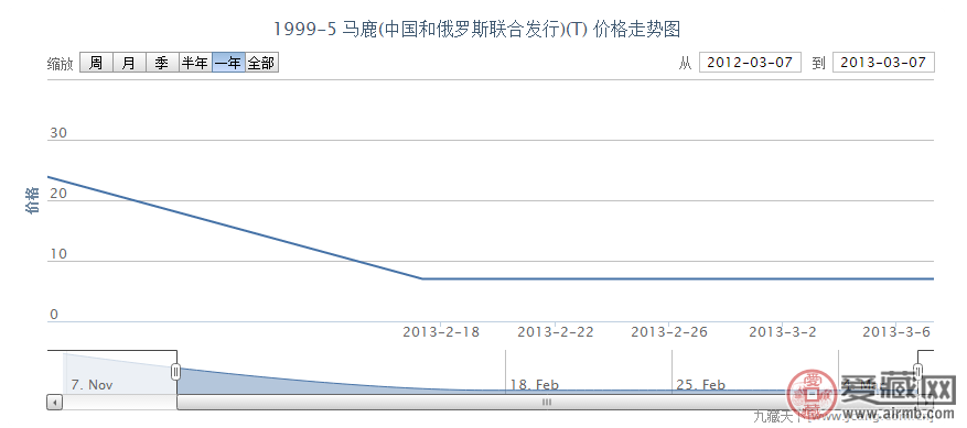 从价格走势上看,我们可以看到,此特种邮票自发行之初,就涨到了三十的高价,由于市场需求,价格一直再调整,比之前的价格在匀速降低,到达2013年2月份的时候,市场相对稳定,价格保持在7元不变,价格合理是集邮爱好者的最佳选择。
