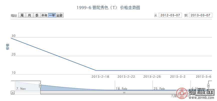 从价格走势上看,我们可以看到,此特种邮票自发行之初,就涨到了三十的高价,由于市场需求,价格一直再调整,比之前的价格在匀速降低,到达2013年2月份的时候,市场相对稳定,价格保持在12元不变,价格合理是集邮爱好者的最佳选择。