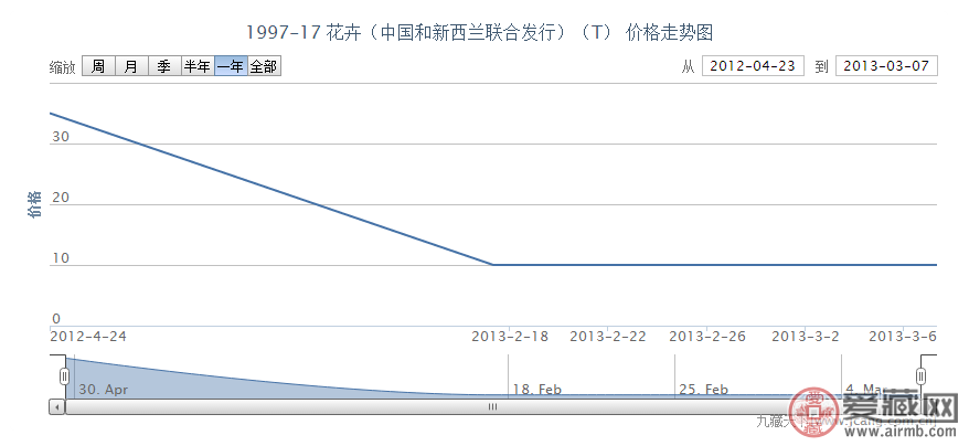 从价格走势上看,我们可以看到,此特种邮票自发行之初,就涨到了将近三十多的高价,由于市场需求,价格一直再调整,比之前的价格在匀速降低,到达2013年2月份的时候,市场相对稳定,价格保持在10元不变,低价销售更加吸引集邮者的眼球。
