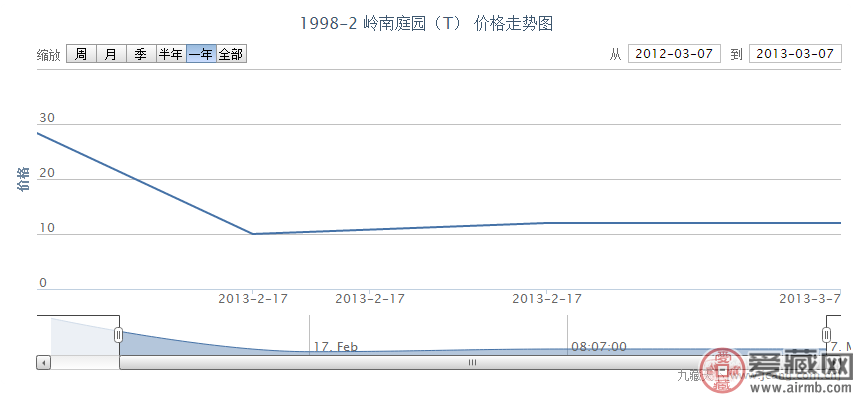 从价格走势上看,我们可以看到,此特种邮票自发行之初,就涨到了将近三十的高价,由于市场需求,价格一直再调整,比之前的价格在匀速降低,到达2013年2月份的时候,市场相对稳定,价格保持在10元不变,价格合理是集邮爱好者的最佳选择。