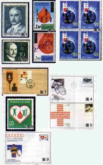 提起献血,就不能不提到卡尔·兰德斯泰纳(KarlLandsteiner),正是他于1900年发现了血型,开辟了现代输血的道路。奥地利邮政在兰德斯泰纳诞生100周年之际,于1968年发行了1枚纪念邮票,邮票展示了他的半身像(图1)。前民主德国也为他发行过1枚纪念邮票(图2)。1994年,欧洲邮政联盟将当年欧罗巴邮票的主题定为“重大发现和发明”,在奥兰群岛邮政发行的邮票中,展现了4种血型以及与遗传之间的关系(图3)。