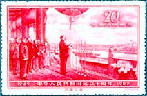 1950年7月1日发行的纪4《中华人民共和国开国纪念》邮票,全套4枚。图案均为天安门开国典礼阅兵式,大型的票幅,精美的设计,表现出中国人民从此站起来的气势。并有再版和东北贴用、东北贴用再版邮票。