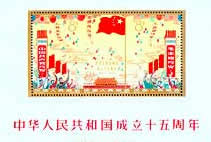 1964年国庆节发行的纪106《中华人民共和国成立十五周年》邮票,全套3枚横联印,分别为“中国共产党万岁”、“庆祝中华人民共和国成立十五周年”、“毛主席万岁”。邮票图案中各族人民聚集在北京天安门广场,热烈庆祝国庆佳节。小全张1枚,与邮票同图,邮票之间未打齿孔,非常特殊(图3)。